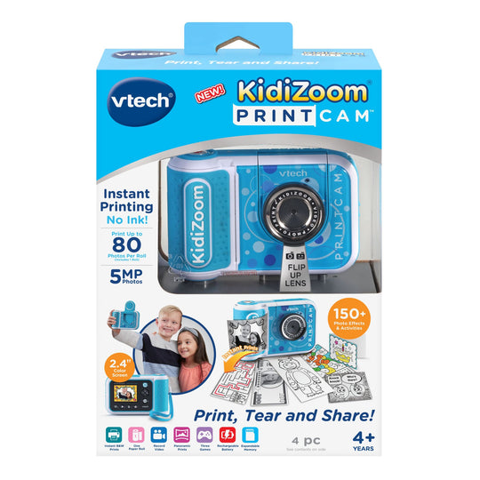 Take a photo and print it instantly with the KidiZoom Print Cam! The flip-up lens allows for easy selfies too. The camera is jam-packed with fun features like special photo effects, stamps and borders, 3 games, panoramic prints and comic strip maker. You can also turn your photos into line drawings to colour or use the print shop to print games, design and print your own cards, pretend money, accessories, and more.