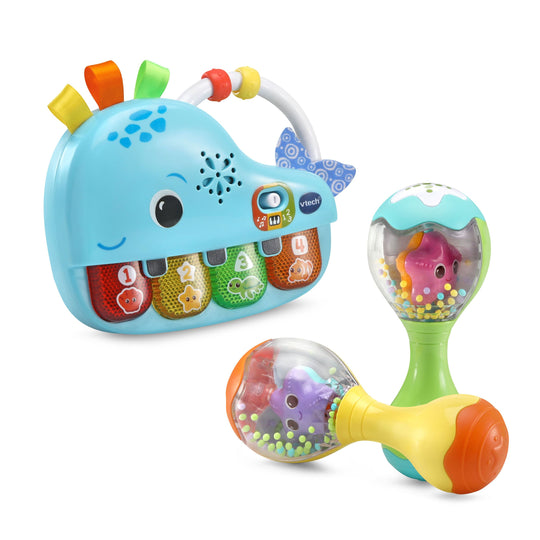 Discover ocean wonders as little ones explore the instruments as mini musicians’ on the whale piano, create rhythmic beats with the starfish maraca, and add a splash of harmony with the peek-a-boo sea turtle tambourine.