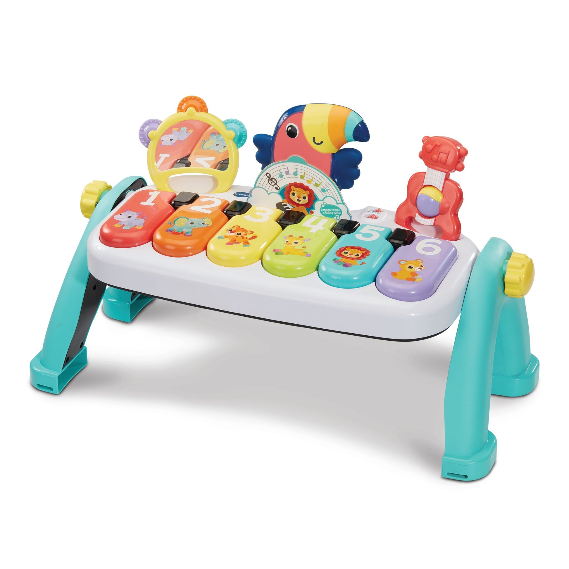 Manipulatives encourage fine motor development. Two easy-press buttons play piano and drum sounds. Spin the animal dial to get to know animal friends and learn about animals and numbers. Turn the music disc to hear sounds and music.