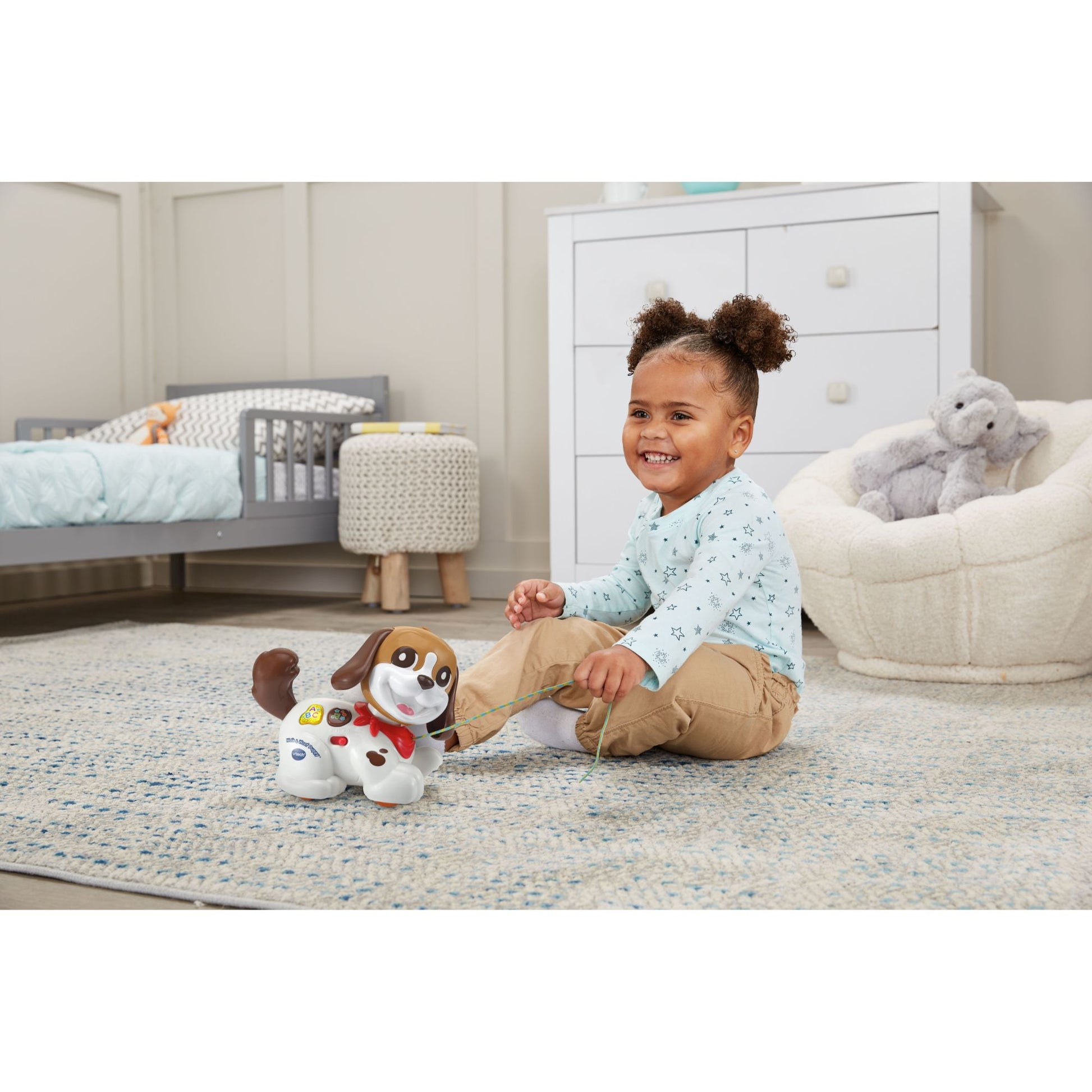 Meet the Walk & Woof Puppy! This cute pull-along puppy is sure to be baby's best friend! Pull or push the puppy along to see puppy wobble and walk and trigger cute interactive phrases about where to go for walkies and more! Press the ABC button to hear puppy introduce basic letters and friendly phrases. Press the body part button to hear about puppy’s ears, tail and emotions. Includes 5 sing-along songs and 12 melodies. Stroke puppy's head to see puppy's ears move! Spin puppy's tail to hear a fun click-tic sound, encouraging motor skill development! Includes built-in pull cord storage.