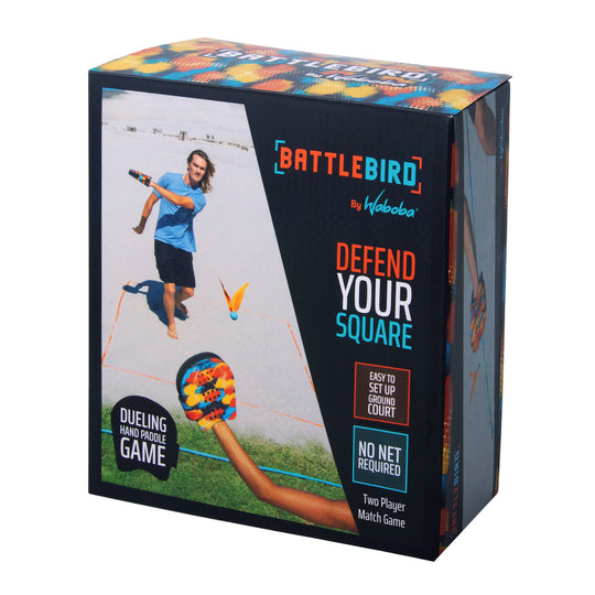 The two player game you never knew you needed! Introducing Battlebird! A two player game featuring VOLI hand paddles, a new fast spinning birdie, and ground court straps. Score points by hitting the birdie into your opponents square. Play in the backyard, park, or beach.