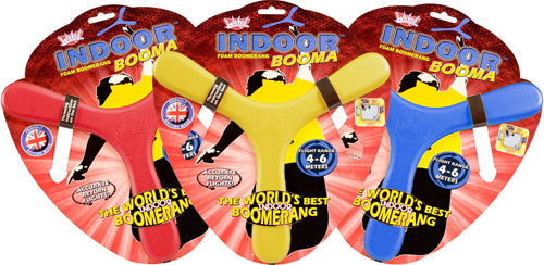 The World's Best Indoor Boomerang. Made of the same soft foam as the Junior Booma but it is twice as dense for bigger flight ranges. Perfect for lounge rooms, gymnasiums. Flight range: 4-6 metres. Available in Red / blue / yellow colours. As this item is an assortment we cannot guarantee a specific style, please let us choose on your behalf. Pictures indicative only.