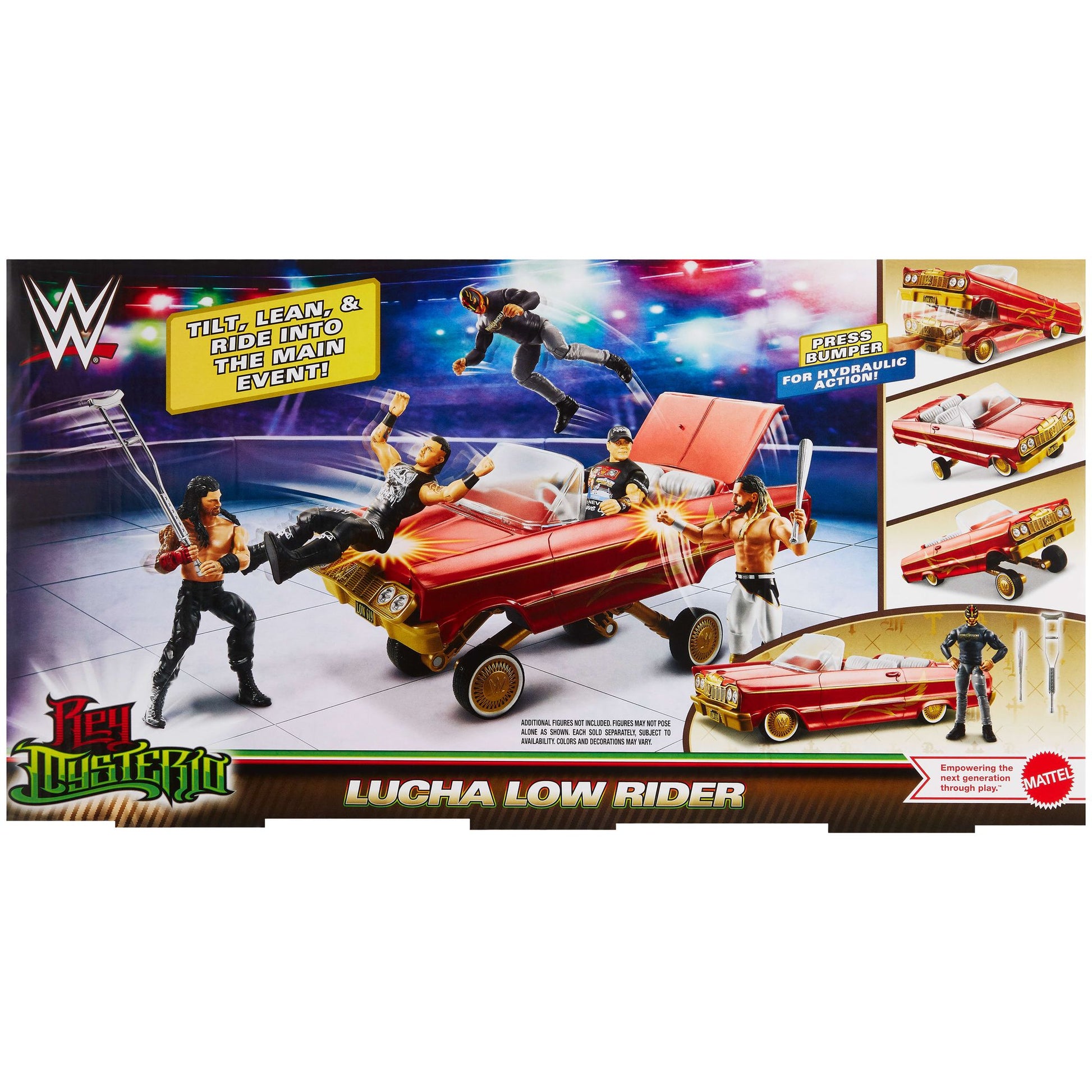 Ride to the ring with the WWE® Lucha Low Rider! Kids can bounce down to the ring with the Lucha Low Rider vehicle's hydraulics action, then slam the seat and launch the included Rey Mysterio Main Event action figure into the match! Colors and decorations may vary.