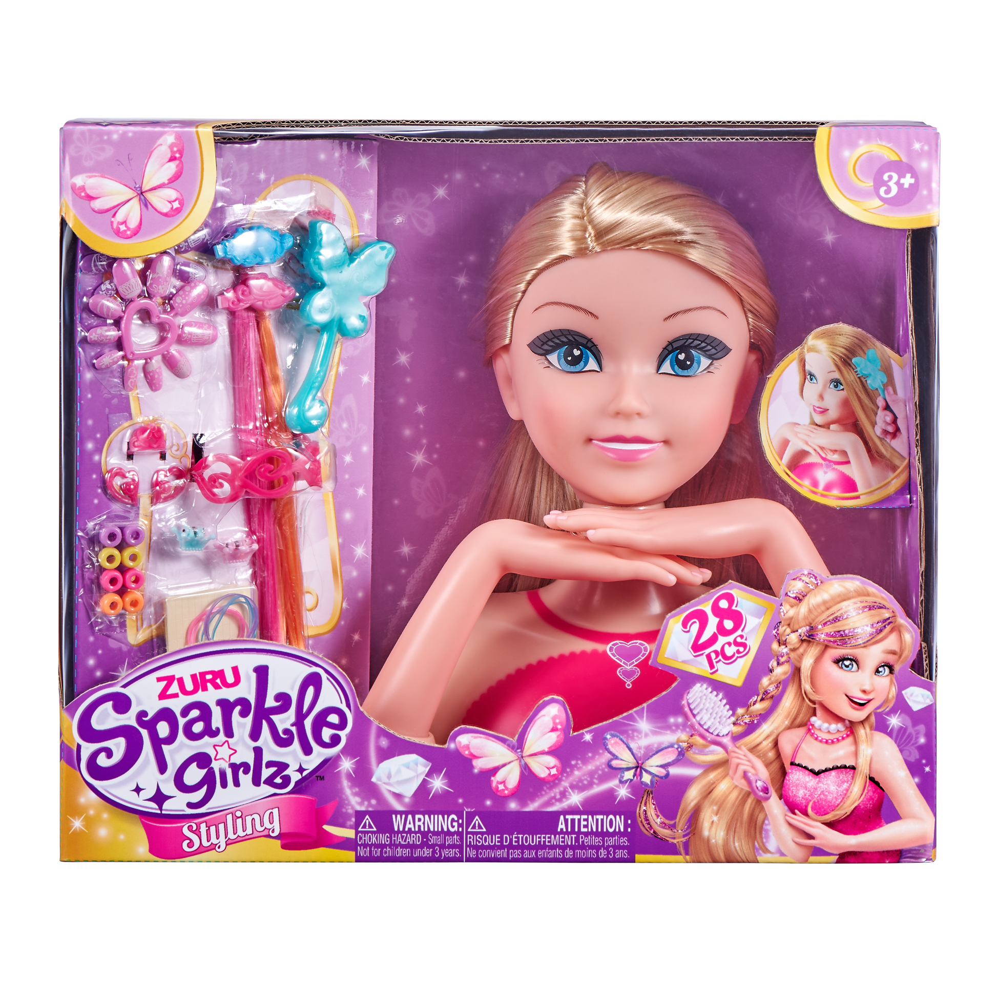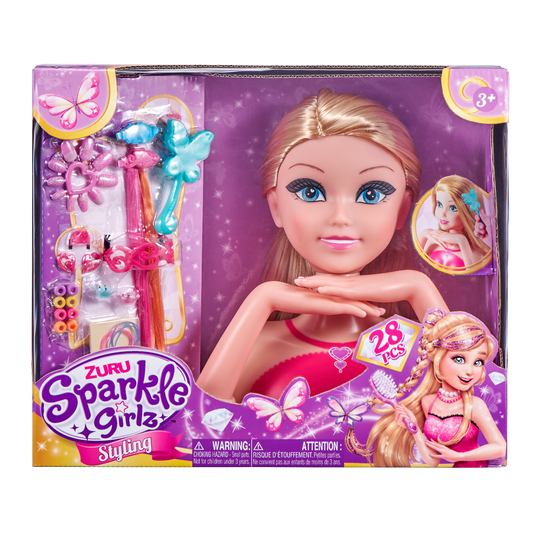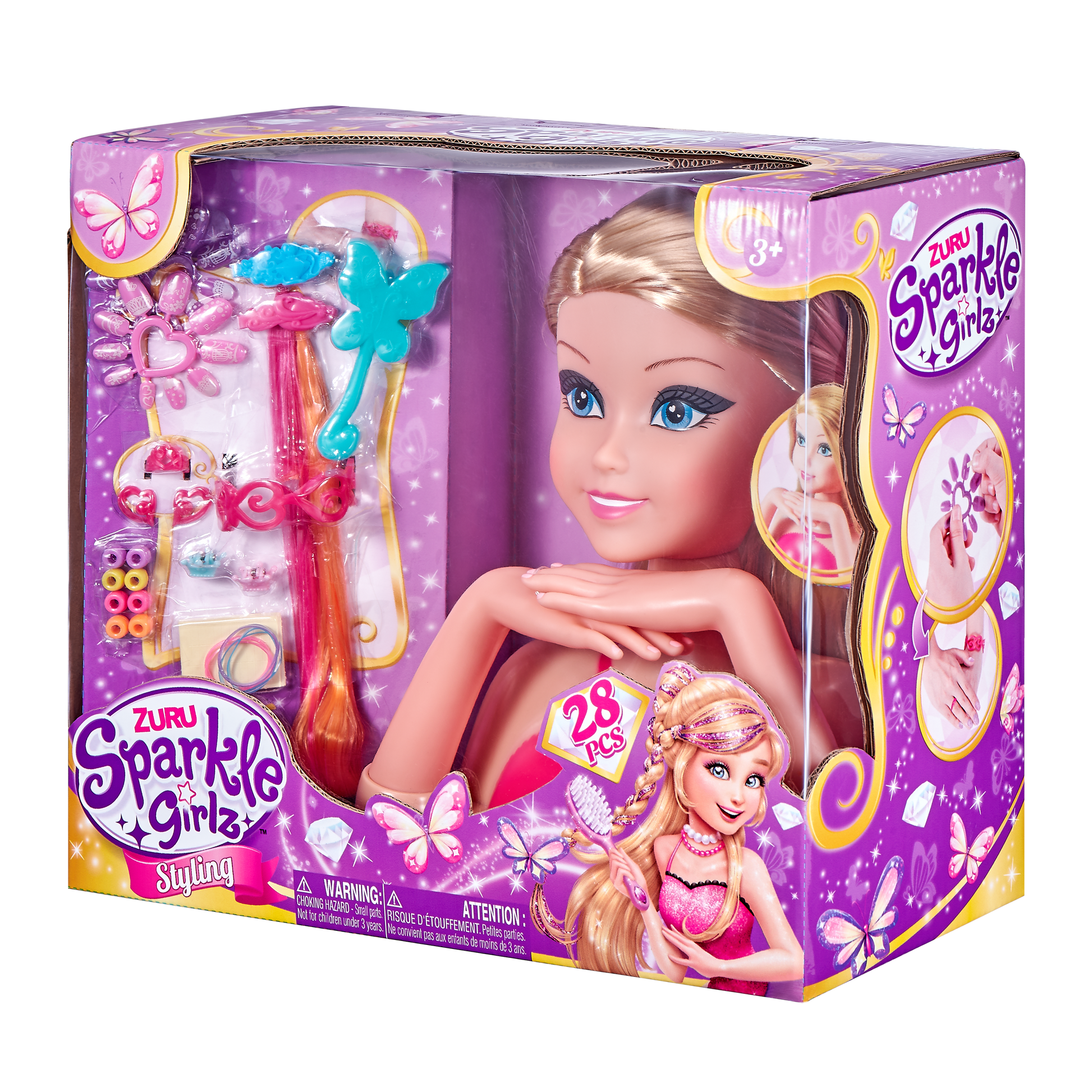 ZURU Sparkle Girlz Nail Design Styling head includes a beautiful princess styling head for you to play with her beautiful soft hair. You can brush her hair with her majestic brush and decorate with colorful hair highlight accessories. Take time to braid colorful beads through her hair and tie with rubber bands at the ends. Decorate her nails and yours too! Set also includes jewelry like bracelet and ring that you can wear and share. Practice styling on her head then practice on your friends! Endless hours of sparkle styling fun! Sparkle every day at an amazing value too! 3+