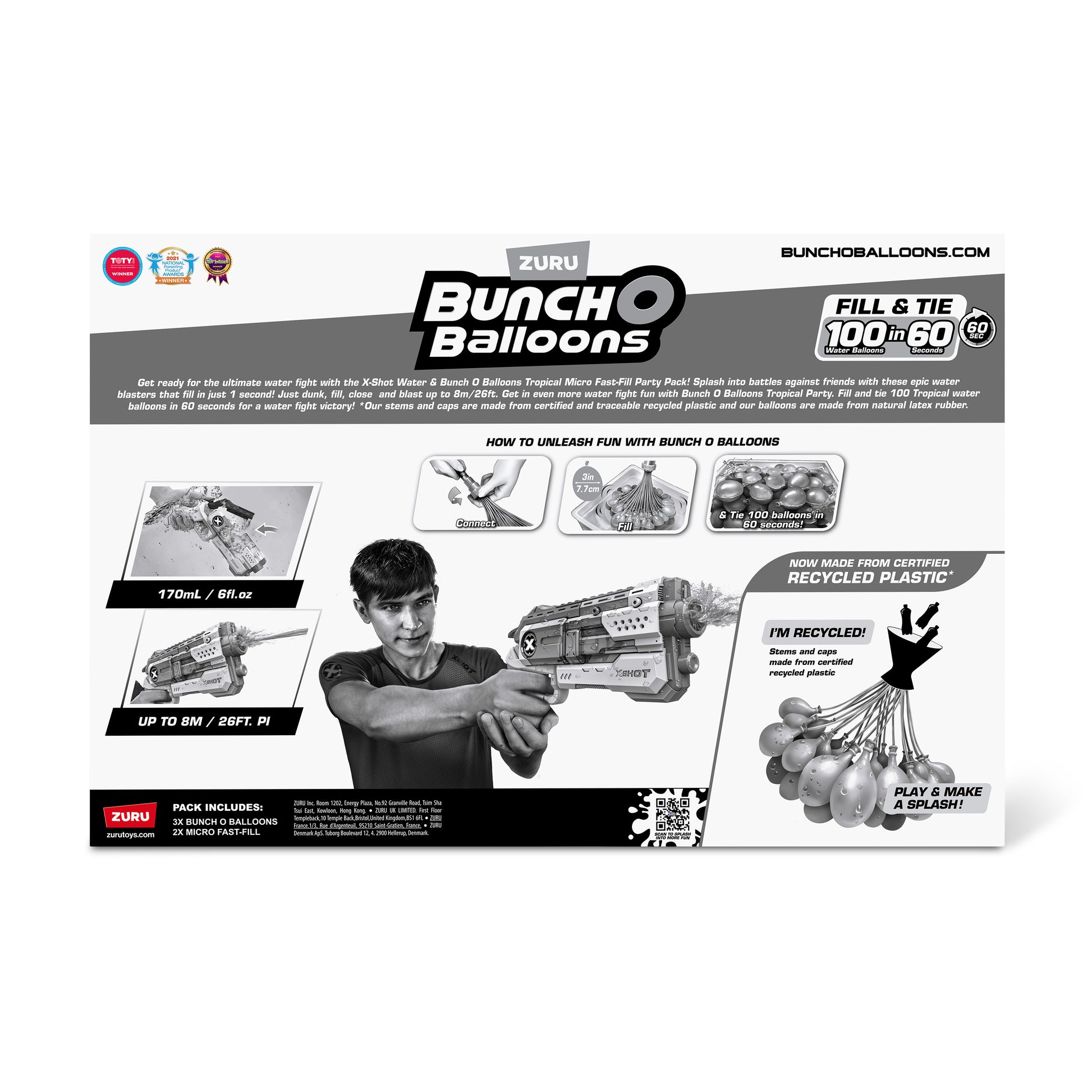 Fill and tie 100 Tropical water balloons in 60 seconds for a water fight victory! Our stems and caps are made from certified and traceable recycled plastic and our balloons are made from natural latex rubber.