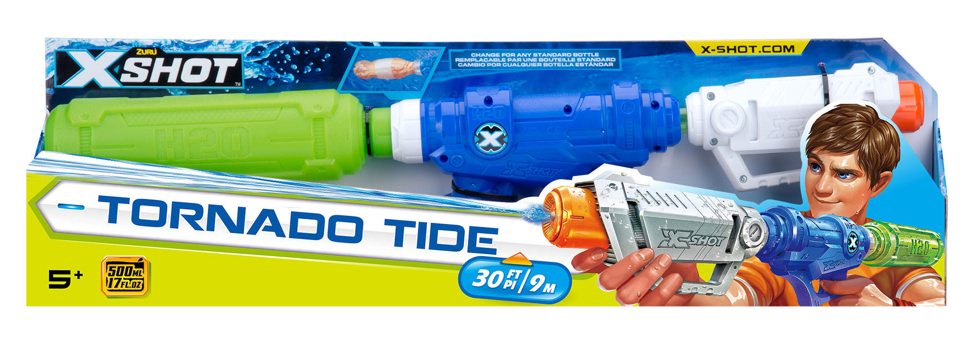 The X-Shot Tornado Tide is packed full of hydropower, blasting water up to 30 feet / 9 meters so you can soak your targets from danger-zone free distances! This blaster features a high-capacity water tank of 550 ml/19.fl.oz to make sure the water blasting action never ends! But that's not all: you can attach any water bottle to make sure your tank is fully loaded at anytime, and that your opponents will never get you off-guard!